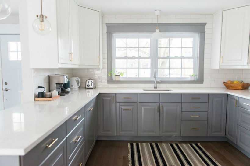 Ещё одним отличным вариантом станет использование нижних шкафов серого цвета с белыми шкафами более светлых оттенков. Это актуально как для угловых, прямых, так и П-образных гарнитуров.