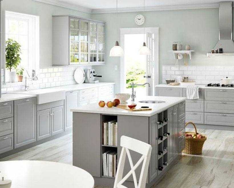 Более спокойные оттенки, например оливковый, пыльно-розовый или лимонный, найдут себе достойное место на серо-белых кухнях, оформленных в классических и деревенских стилях.