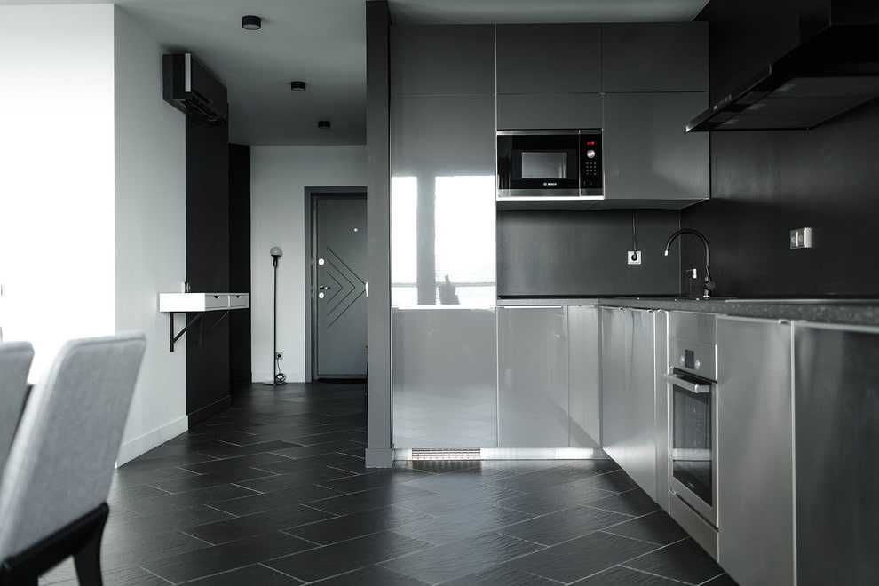 В сером цвете на сегодняшний день можно найти любые отделочные материалы. Это может быть кафельная стена, фартук в темно сером оттенке, акцентная стена, светло-серая мебель и серые обои, кирпич, плитка, шкафчики и техника.