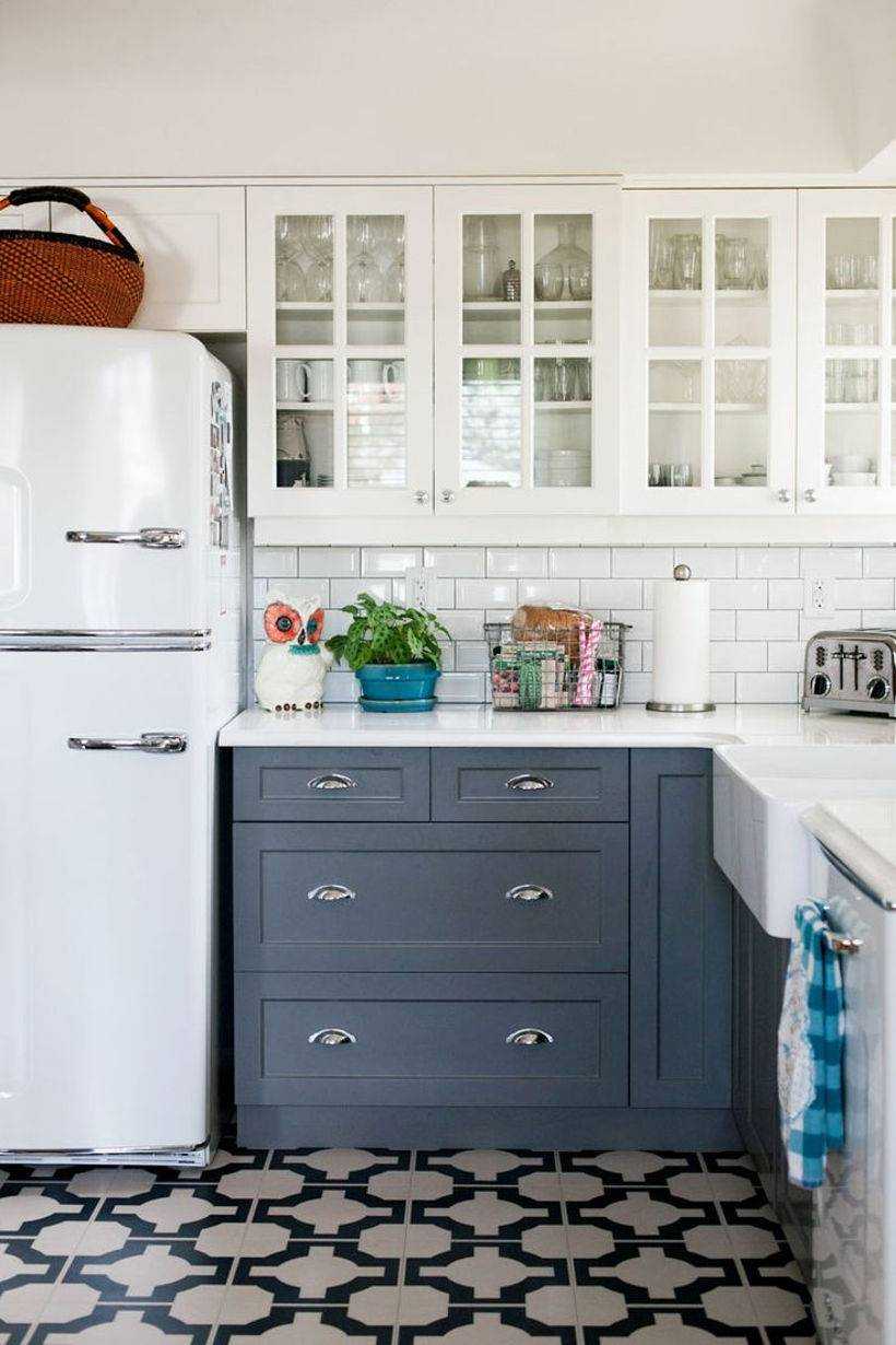 Фото: Черно-белая плитка на полу, темно-серые фасады и белая столешница с верхними шкафами, фартук из белой плитки типа «кабанчик», керамическая мойка и витражный холодильник — образец кухни в стиле ретро.