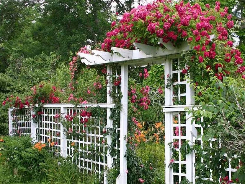 Создается в форме арки, решетки. Каркас, оплетенный лианами или розами, смотрится очень гармонично в саду, палисаднике. Вокруг будут уместны скамейки для отдыха.