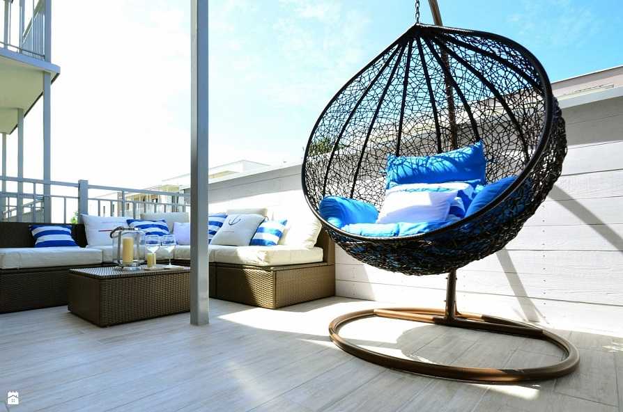 Если речь идет о просторе, то тут можно позволить себе нечто большее. Отдельной большой лаунж зоной может выступить в доме терраса. Мебель в данном случае сыграет одну из немаловажных ролей. Здесь уже можно разместить широкий угловой диван, или длинные деревянные скамейки со спинкой и мягкими подушками, удобные ротанговые кресла, подвесные качели, несколько ярких бескаркасных кресел-мешков.