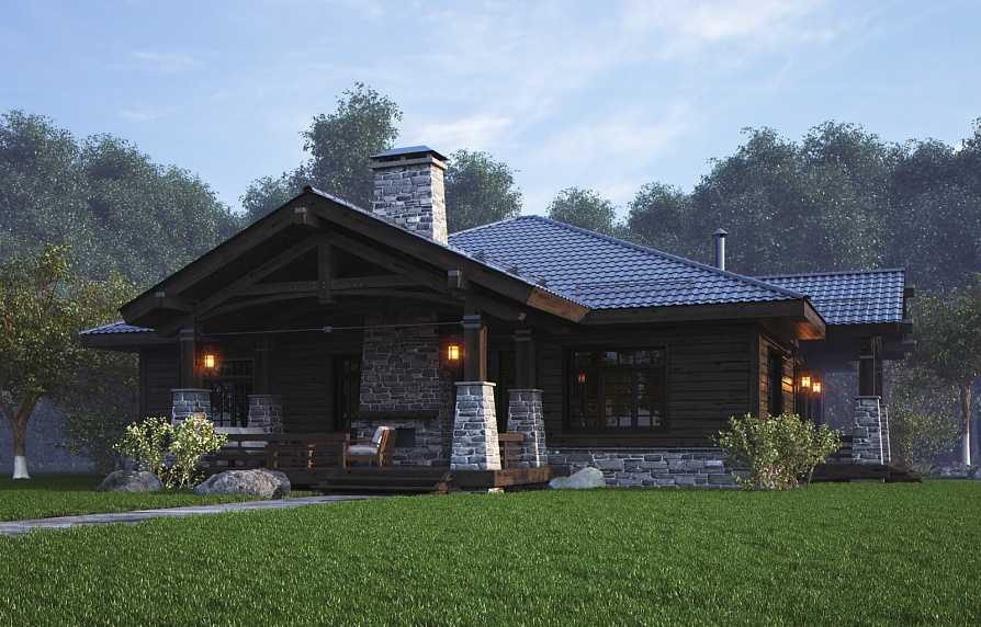 Одной из изюминок этой резиденции является очень выдающаяся веранда, которая подчеркивается коричневыми сложенными камнями и отдельной серой шатровой крышей.