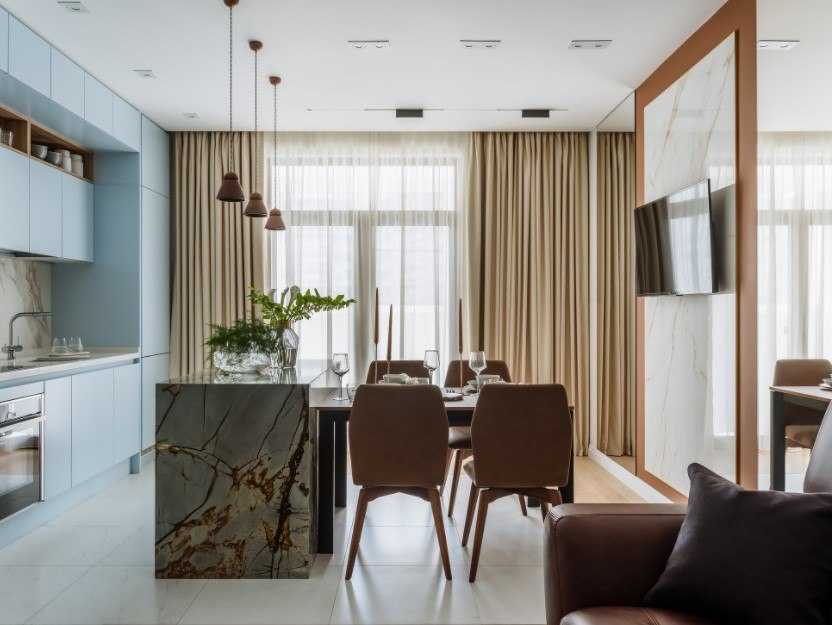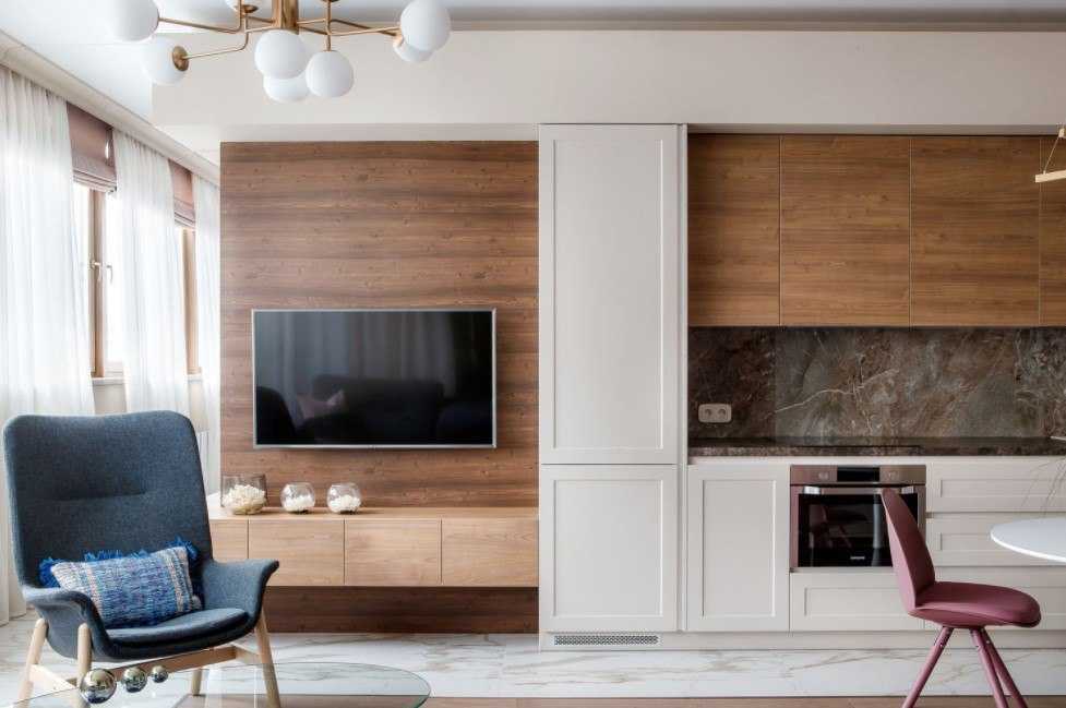 Если у вас студия, то остается лишь создать комфорт и обеспечить функциональность в зоне кухни-гостиной. Рекомендуем использовать натуральные материалы в теплых тонах.
