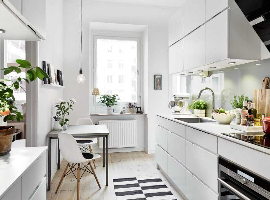 Светлая, чистая и как будто «дышащая» кухонька – прекрасное решение для малых габаритов. Светлый цвет кухни в скандинавском стиле успокаивает нервы, дарит прекрасное настроение и чувство уюта. Светло-серый, голубой, белый, кремовый и подобные оттенки кажутся прохладными, но отлично подходят для кухни, создают ощущение чистоты и простора.