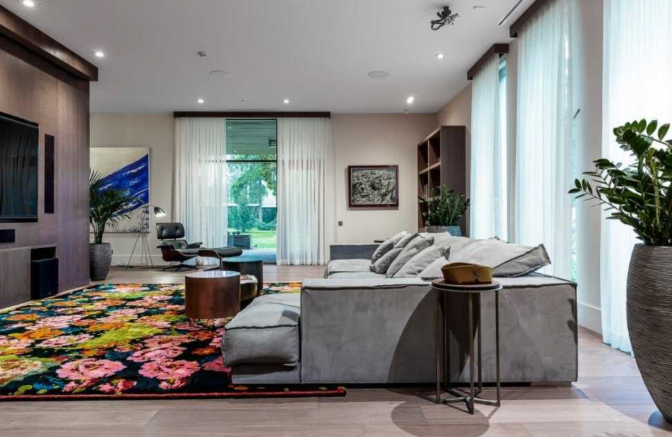 Своеобразным отделяющим барьером между кухней и мягкой зоной отдыха станет барная стойка. Свет и ощущение свежести, обилия воздуха в пространстве обеспечат панорамные окна с видом на сад.