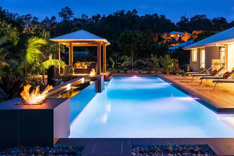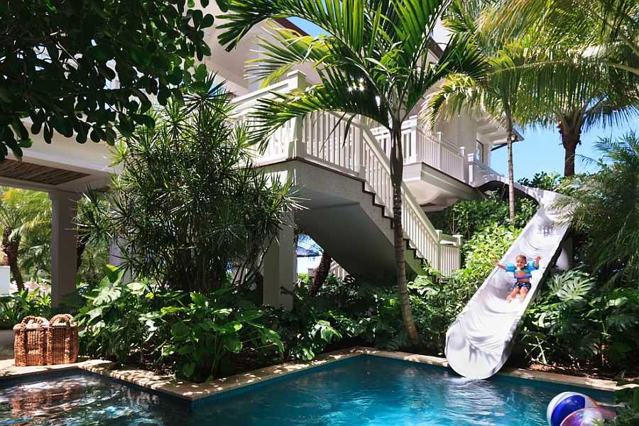Садовый ландшафт вокруг тропического бассейна часто наделен природными скалами, большим количеством зелени и несколькими красочными цветущими растениями. Но для тех, кто не жалеет сил, бассейн с водопадом – идеальное решение, доставляющее удовольствие всей семье. В качестве дополнения может быть горка, которая придаёт определенный шарм бассейну и приносит счастье маленьким детям. Пешеходная дорожка или мост, гроты, играющие роль открытого бара, или кинотеатр – всё это для тех, кто хочет использовать двор в разных целях.