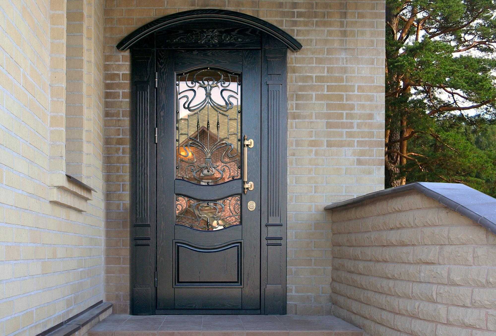 Арочный проем, стеклянные вставки на темном фоне дверного каркаса, кованые перила, уличные светильники, стилизованные под фонари – все способно украсить внешний вид здания в целом и крыльца в частности.