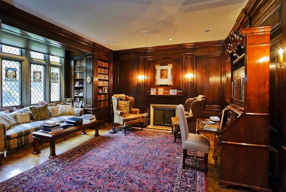 Практически в каждом зале в таком дизайне стоит библиотека, хотя в большом доме она может быть расположена и в отдельной комнате. Удобно при этом сделать помещение частью гостиной, отделив, например, раздвижными дверями, которые при необходимости обеспечат уединение и уют.
