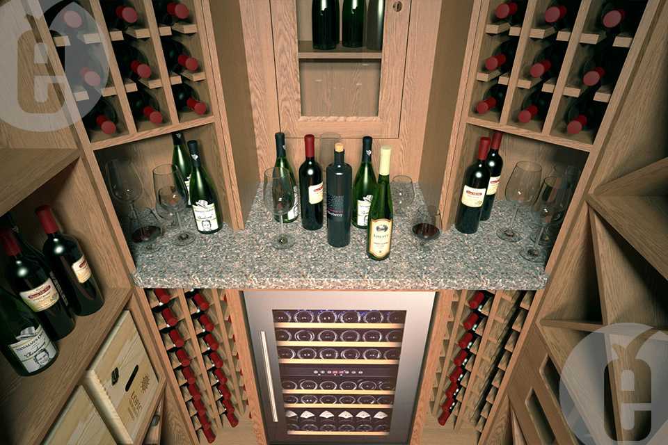 Кроме полок для хранения необходимо предусмотреть полку, где можно оставить бутылку в вертикальном положении, чтобы перед употреблением дать осадку опуститься. Не помешает отдельный шкафчик для хранения картотеки и бокалов. Если места для стола и стульев не хватает, можно установить барную стойку.