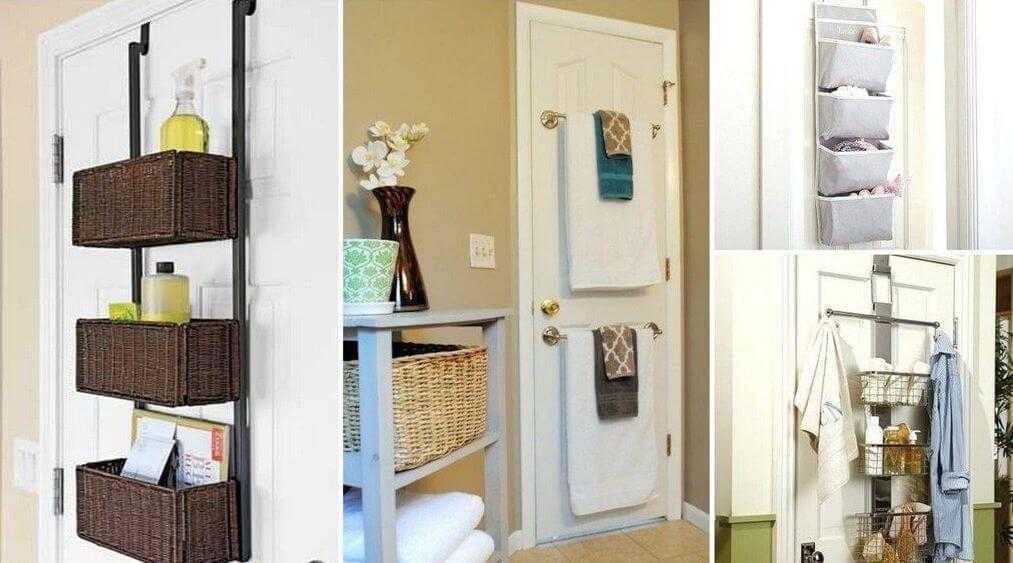 Межкомнатная дверь в ванную тоже может выступать в качестве места для хранения. На ней удобно разместить крючки для полотенец или халатов. Пригодятся и различные тканевые или пластиковые органайзеры, куда войдут как средства по уходу, так и электроприборы.