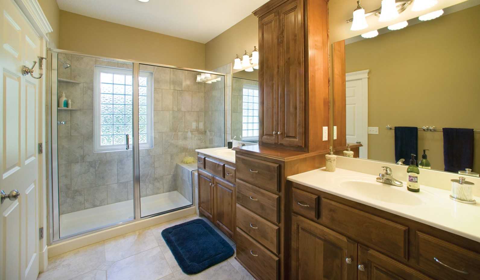 Обеспечить порядок в ванной и без лишних усилий поддерживать его поможет правильно подобранная мебель. Под раковиной можно расположить удобную тумбу, а в угол поставить шкаф-пенал небольшого размера.