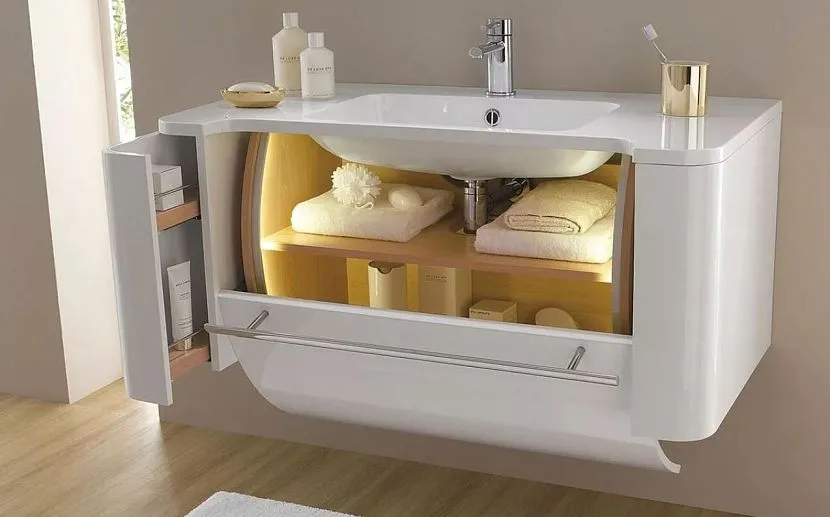 Не оставляйте пустовать место под раковиной. Разместите там небольшой шкафчик или полку.