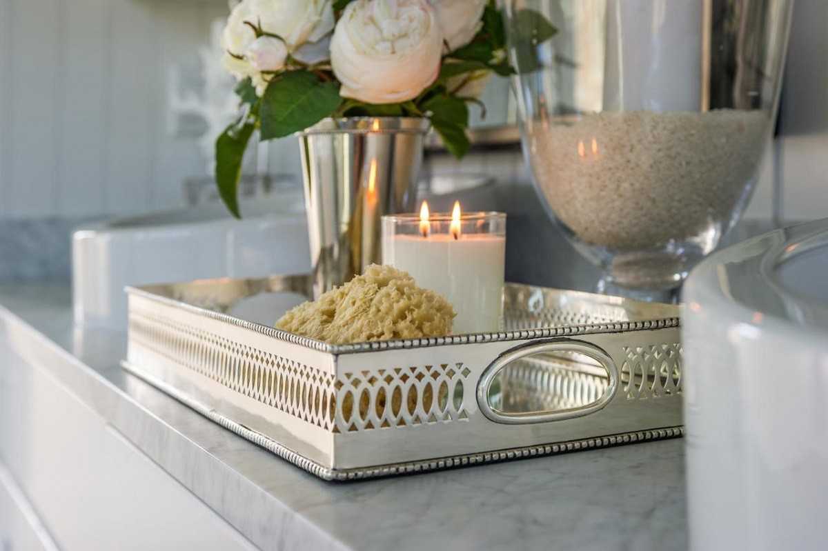 Небольшие подносы хорошо компонуют и собирают в единую композицию разные предметы. Это могут быть баночки с кремом по уходу за лицом и телом. Удобство заключается еще и в том, что при уборке не нужно убирать каждый предмет – можно это сделать одним движением руки, подняв поднос.