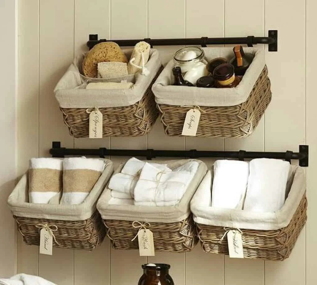 Аккуратные плетеные корзины из ротанга и лозы принесут в помещение не только порядок, но и уют. Их можно использовать для хранения полотенец, разных мелочей и косметических средств.