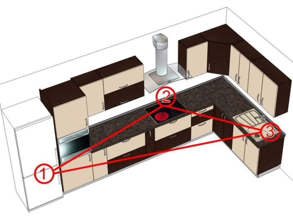 Расстановка мебели должна соответствовать циклу перемещения по кухне в процессе готовки: от холодильника к рабочему месту, дальше мойка, стол для нарезания и разделывания, и в конце цикла варочная поверхность или духовой шкаф.