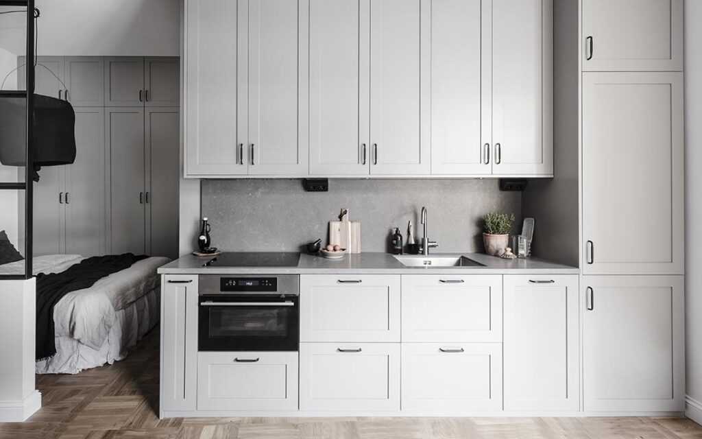 Типичный комплект кухонной мебели состоит из шкафа под раковиной (обычно шириной 80 см), 2-3 стоячих шкафов (включая один с выдвижными ящиками) и подвесной мебели такой же ширины, как и нижние шкафы.