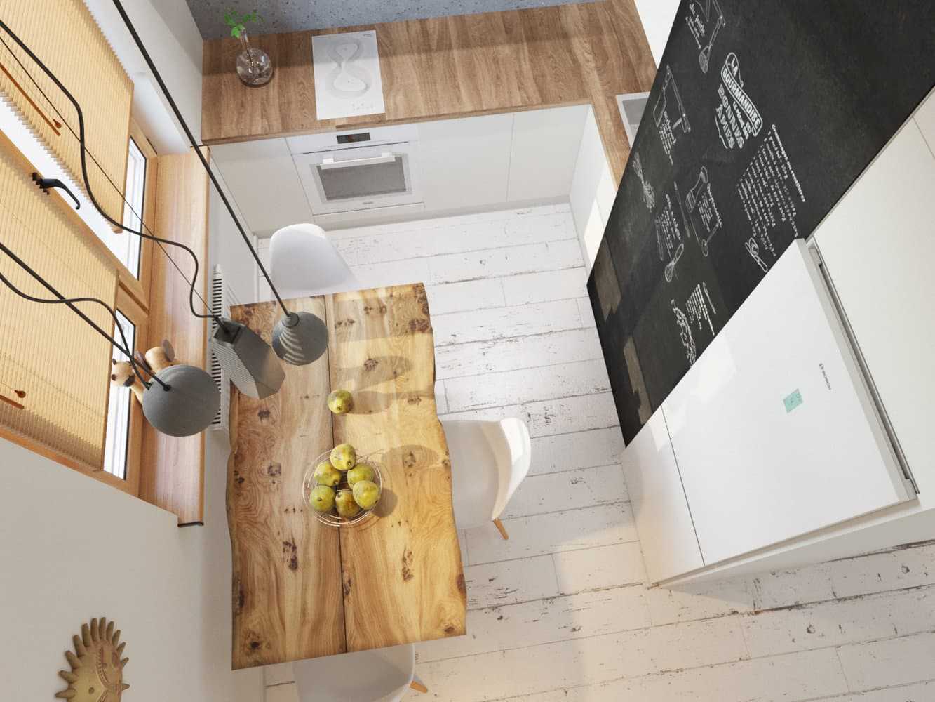 Кухонный гарнитур подбирался по принципу максимального слияния со стенами. Исключение составляет вентиляционный короб – его выкрасили черной магнитно-графитовой краской, на которой можно рисовать и оставлять любовные послания. Навесные полки под самый потолок не только позволяют максимально эффективно использовать пространство, но и усиливают ощущение монолитности стены. Эко-мотивы выражены в деревянных столешницах и оконной раме.