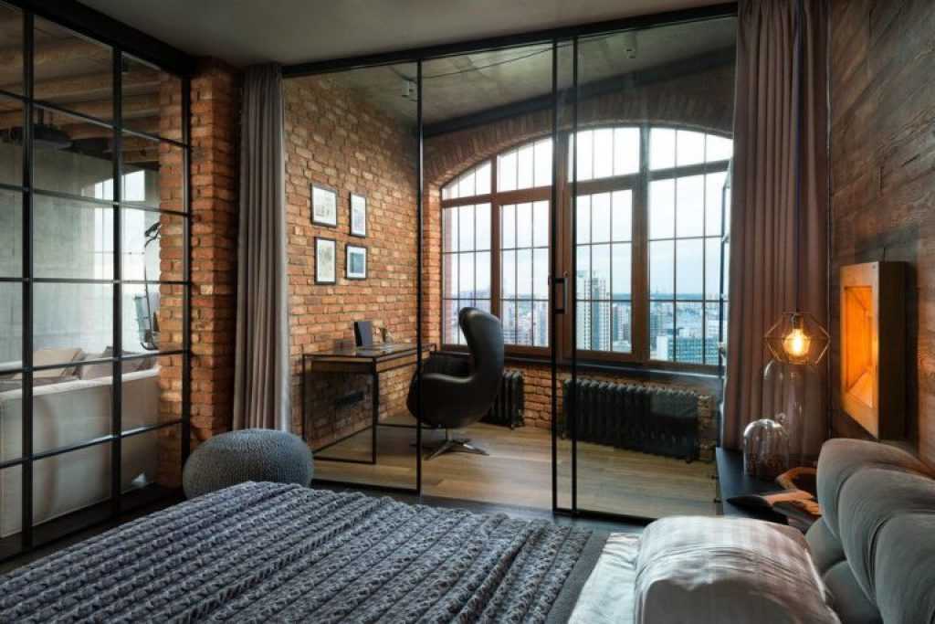 Индустриальный стиль в квартире студии – популярный выбор творческой молодежи. Спальня и гостиная в одной комнате с модным дизайном в стиле лофт не приемлет ограждений. Для такой обстановки возможна только свободная планировка, сохраняющая свободу передвижения. Зона для сна ничем не ограничивается, интерьер должен иметь большое остекление и много света. Для зонирования применяется различная отделка стен, покрытий для пола. Кирпичная отделка может сочетаться со штукатуркой, покраской. Зона гостиной выделяется большим диваном, ковром.