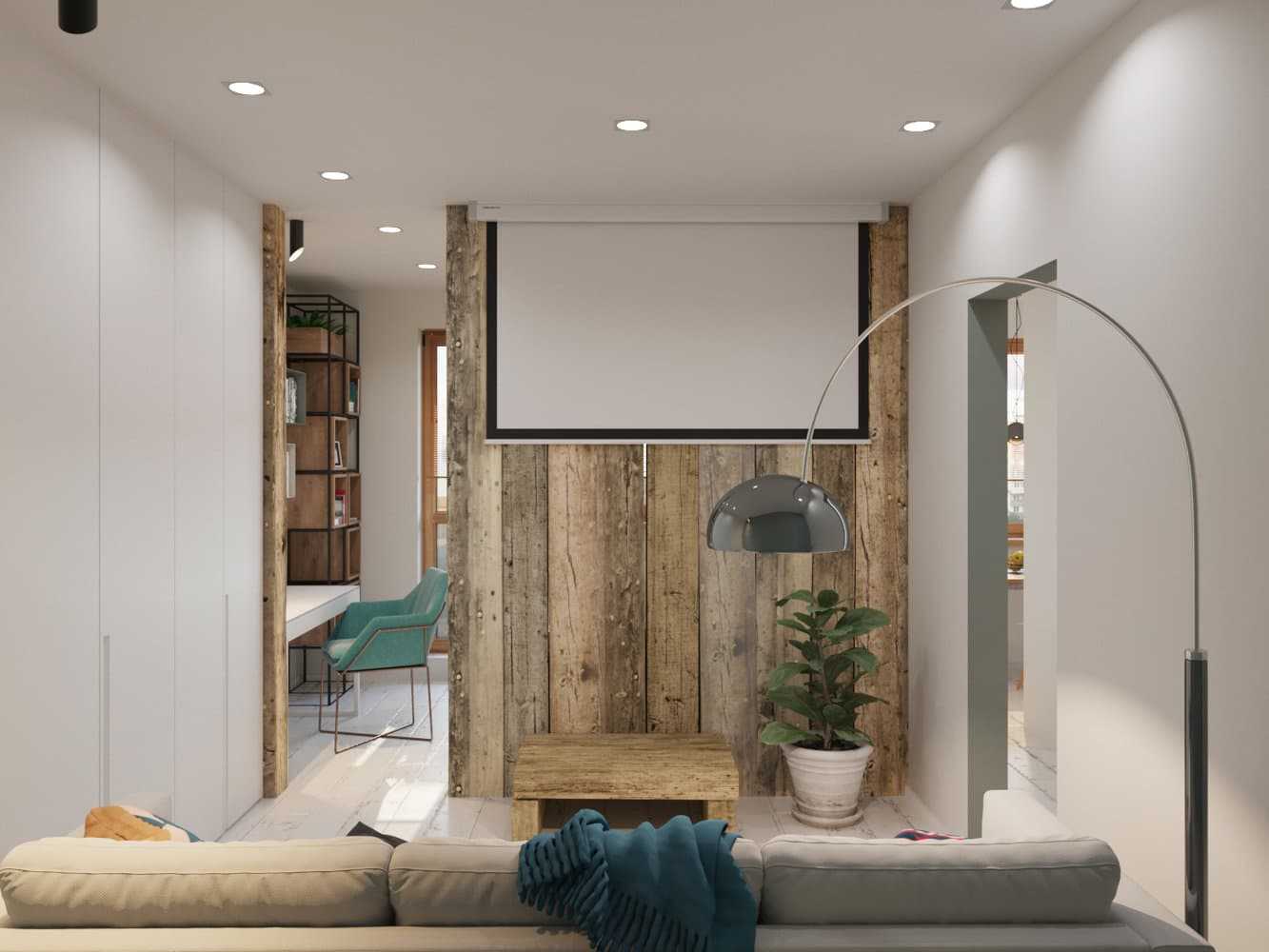 Даже такой приземленный стиль как эко может получиться легким и не перегруженным благодаря светлой цветовой гамме (общей для всей квартиры). Концепт интерьера основывается на минимуме текстур и элементов: дерево грубой обработки, окрашенные стены, максимально встроенные системы хранения. Так, шкафы в гостиной настолько незаметны, что визуально полностью заменяют собой одну из стен. Интересно, что в качестве перегородки между гостиной и спальней использованы необработанные доски, а вместо телевизора – экран для проектора, который можно раскрыть или спрятать в любой момент.