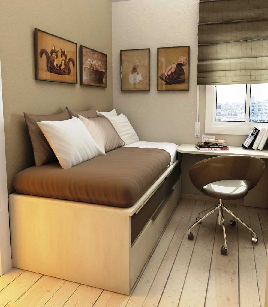 Угловые столики помогают освободить место в комнате для шкафа, кровати или техники. Но если места очень мало, рекомендуется разместить в комнате кровать-чердак и рабочую зону под ней.