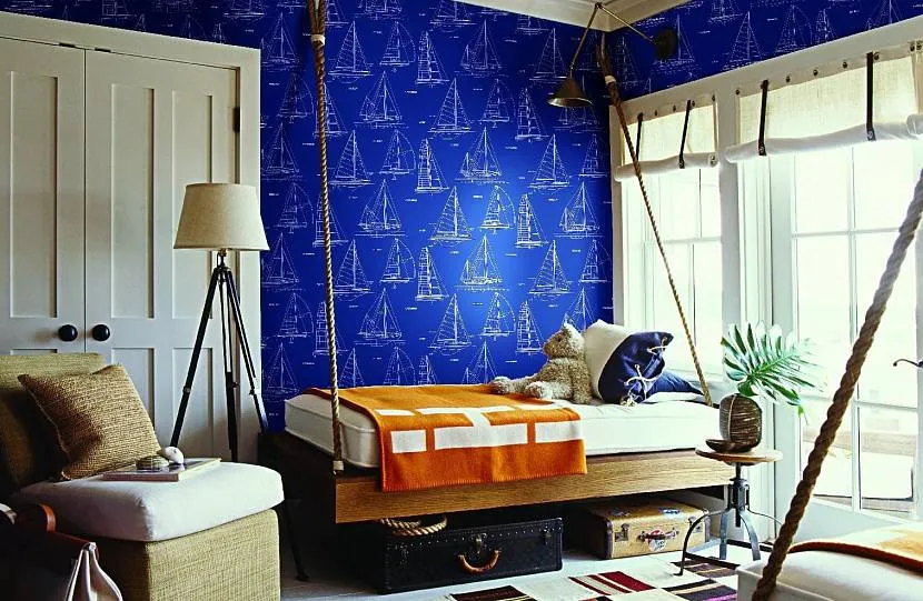 В качестве покрытия стен выбираем обои. В магазинах сегодня представлено много их видов на морскую тематику. Это могут быть полотна: