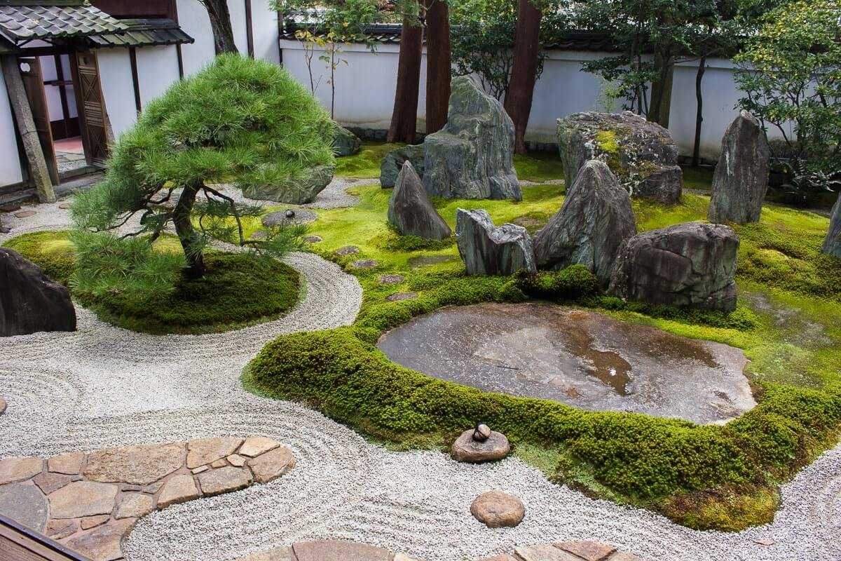 Лучше всего в японском саду смотрятся замшелые камни, слоистые, с острыми сколами и углами — их сложно заподозрить в неестественности. Поверхность валунов не обрабатывается. Камни не должны быть более метра высотой. Их количество в саду может быть любым, но обязательно нечетным. Располагают камни группами: по 2-3 экземпляра, где один — большой и пара — поменьше. Пространство между группами засыпается мелкой галькой, гравием или засаживается мхом и почвопокровными растениями.