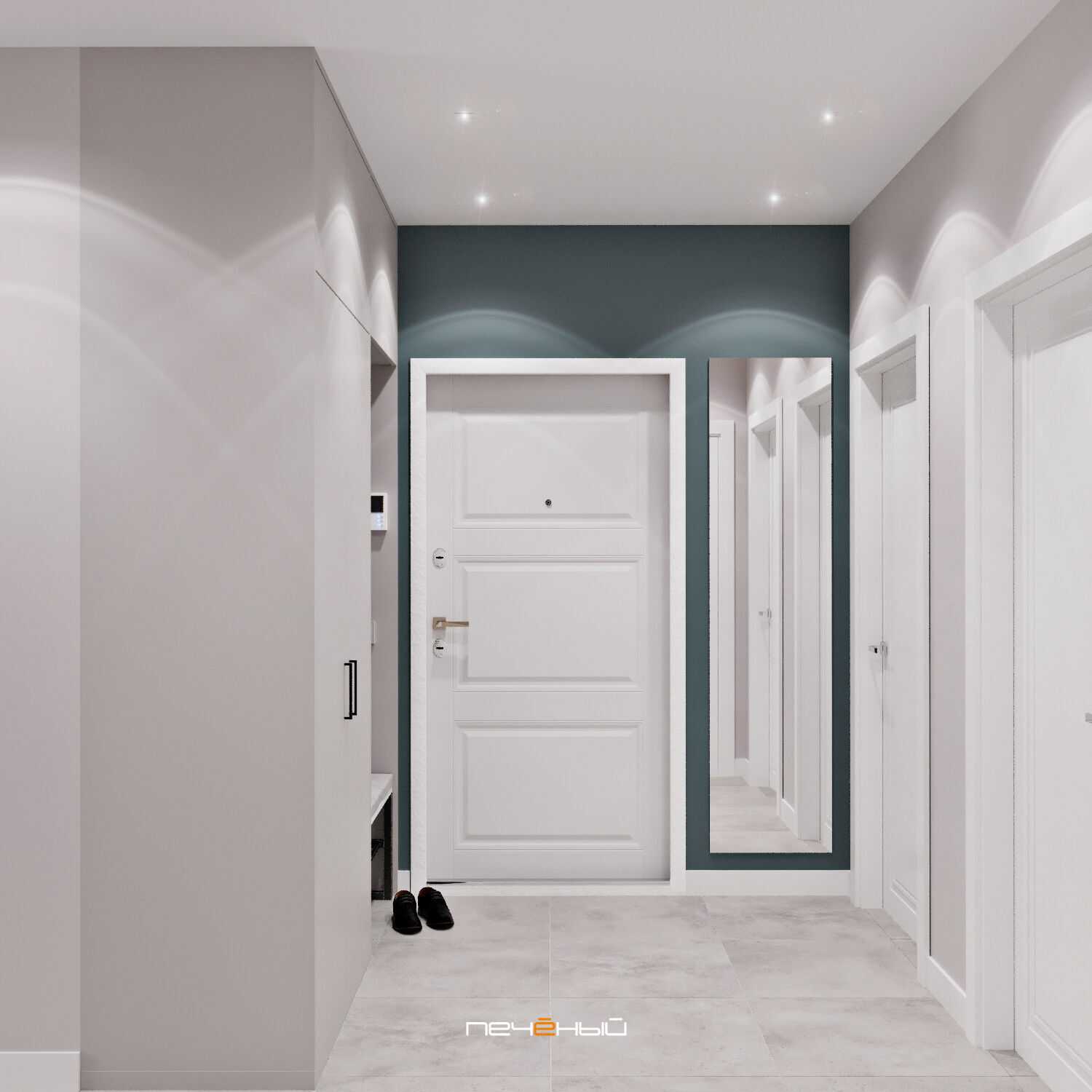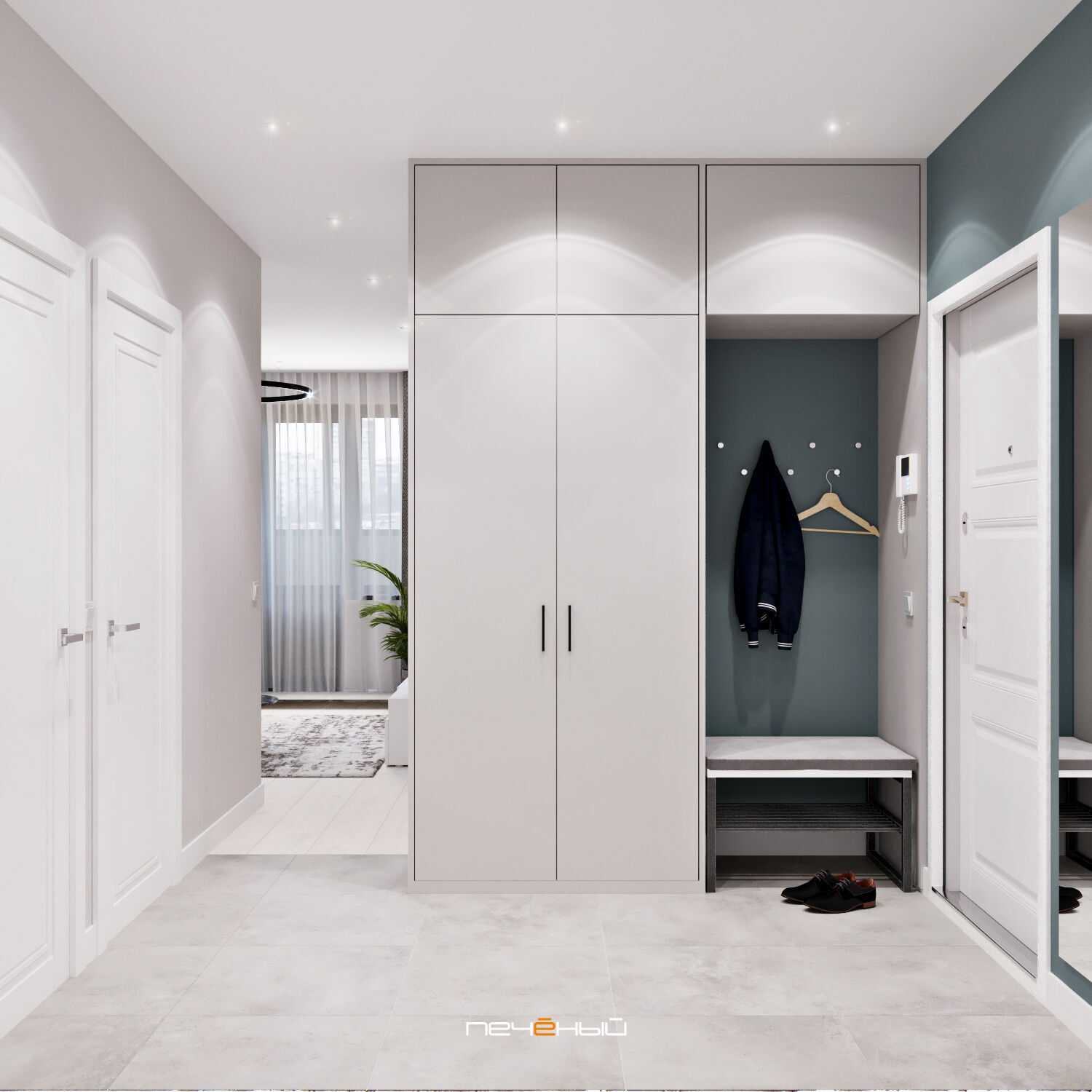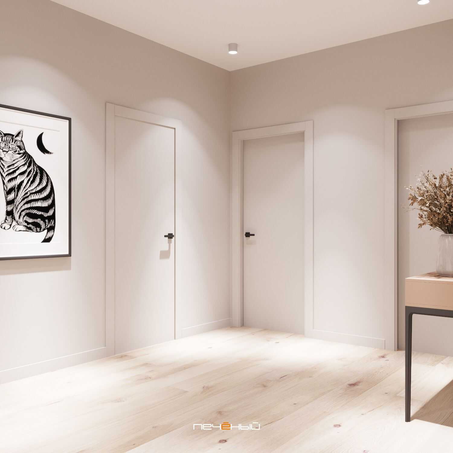 Воздушный интерьер прихожей. Небольшая прихожая продолжается широким коридором. Чтобы обилие дверей не резало пространство, мы окрасили все поверхности в один, очень светлый оттенок.