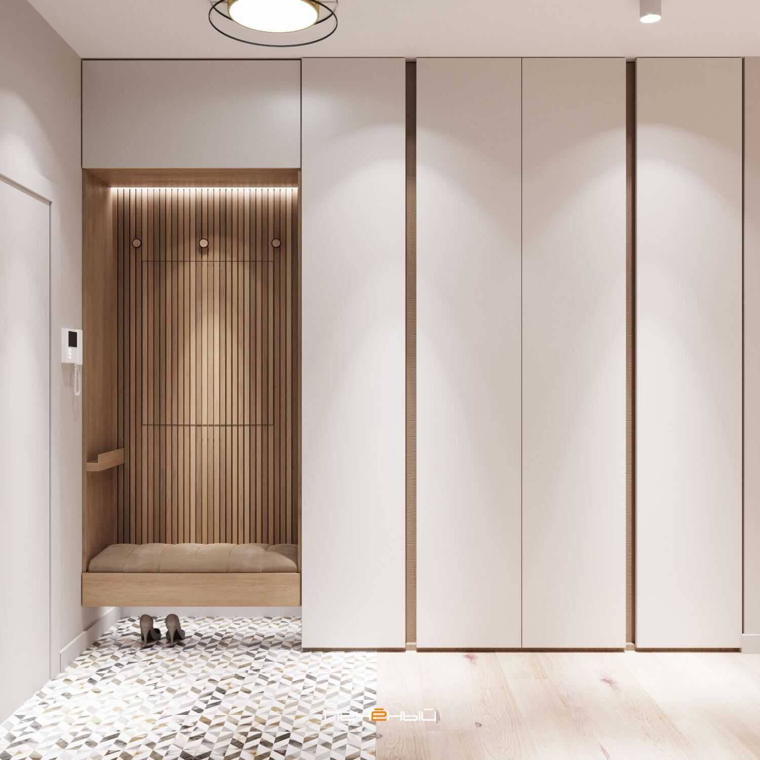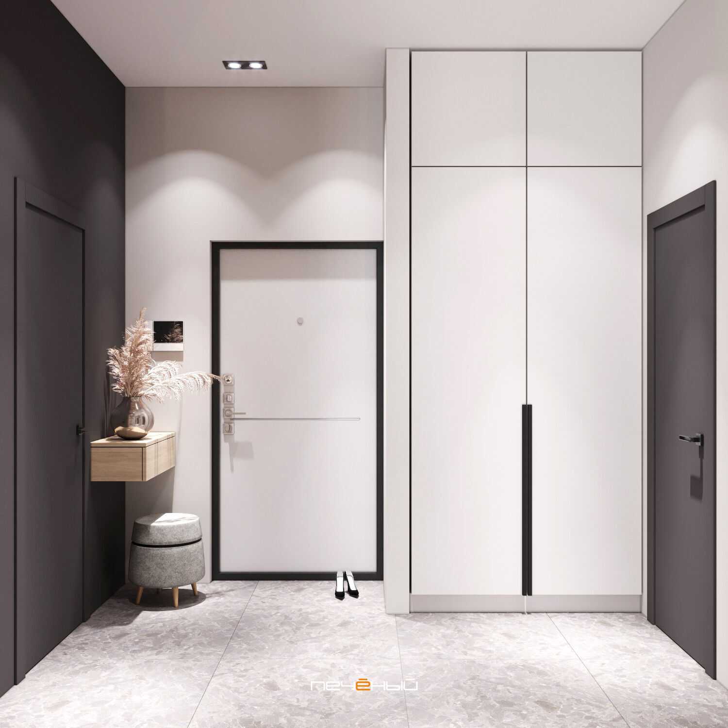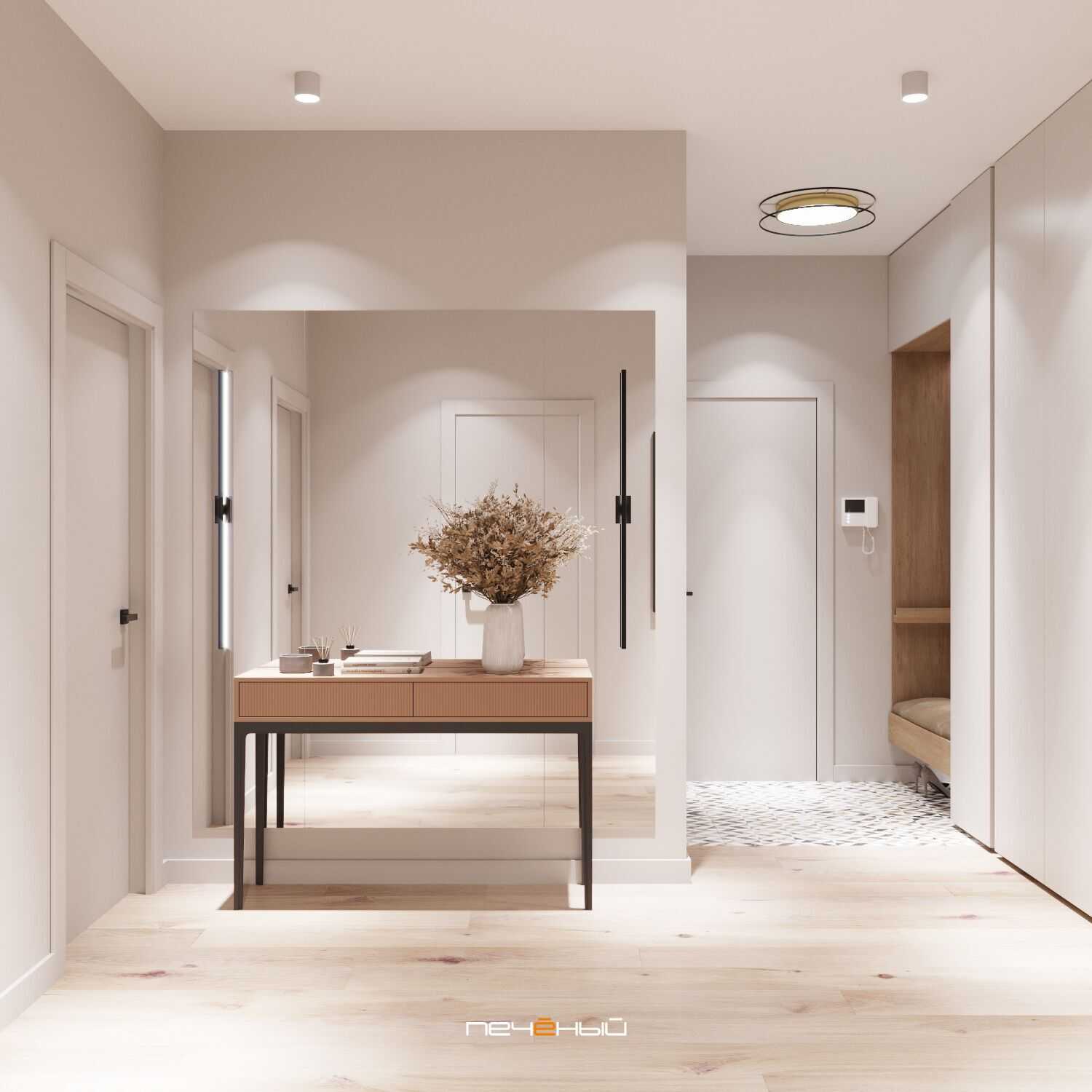 Воздушный интерьер прихожей. Небольшая прихожая продолжается широким коридором. Чтобы обилие дверей не резало пространство, мы окрасили все поверхности в один, очень светлый оттенок.