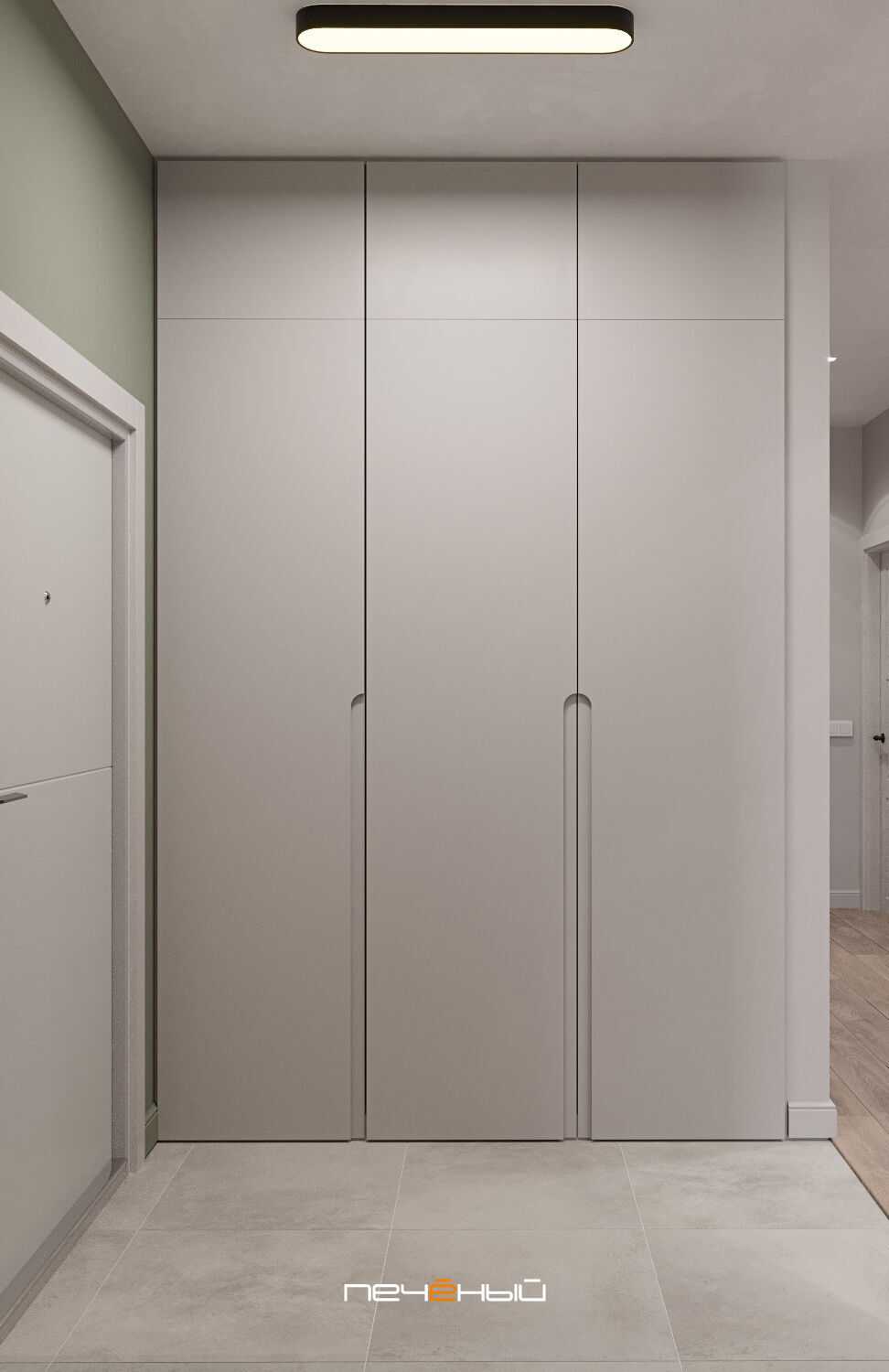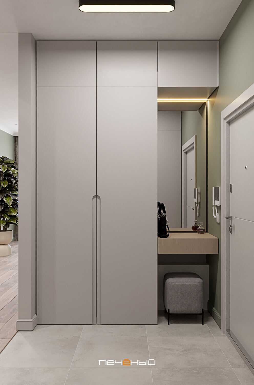 Серо-зеленая маленькая прихожая, дизайн которой — сплошь шкафы