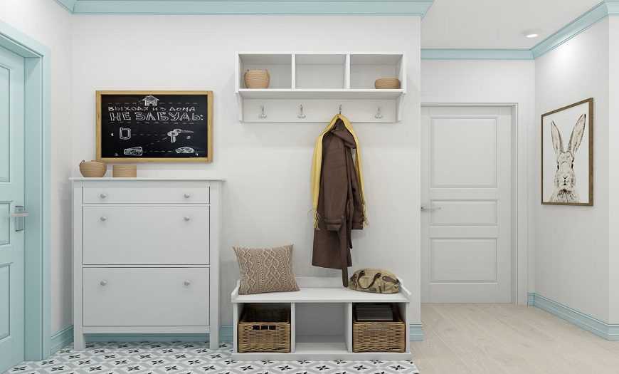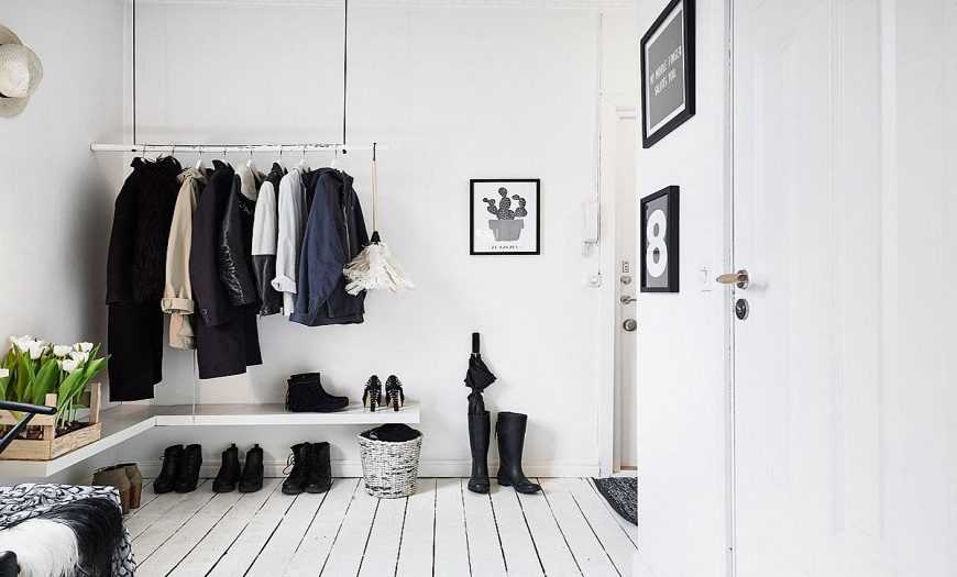 Отличное решение — это небольшие стеллажи с открытыми полками. Стандартный вариант — крючки для одежды на стене, сверху можно расположить корзины для головных уборов, а снизу этажерки для обуви.