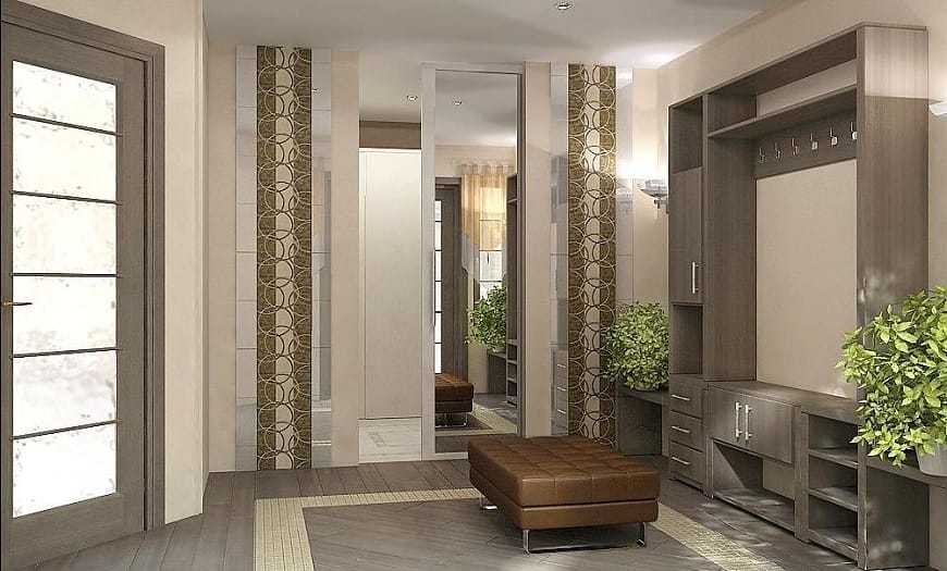 Можно постелить ковер с оригинальным рисунком. Такой же узор наклеить на стену и потолок. Качественные стеновые панели и зеркальная стена — идеальные варианты оформления интерьера прихожей.