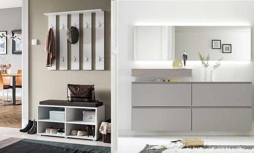 В зависимости от предпочтения покупателей и дизайна интерьера, можно подобрать разную комплектацию, тумбы для обуви можно выбрать открытые или закрытые, шкаф – классический, модульный или купе с бесшумными раздвижными системами. Все предметы в наборе должны быть несложных конструкций, удобными и практичными для ежедневного использования.
