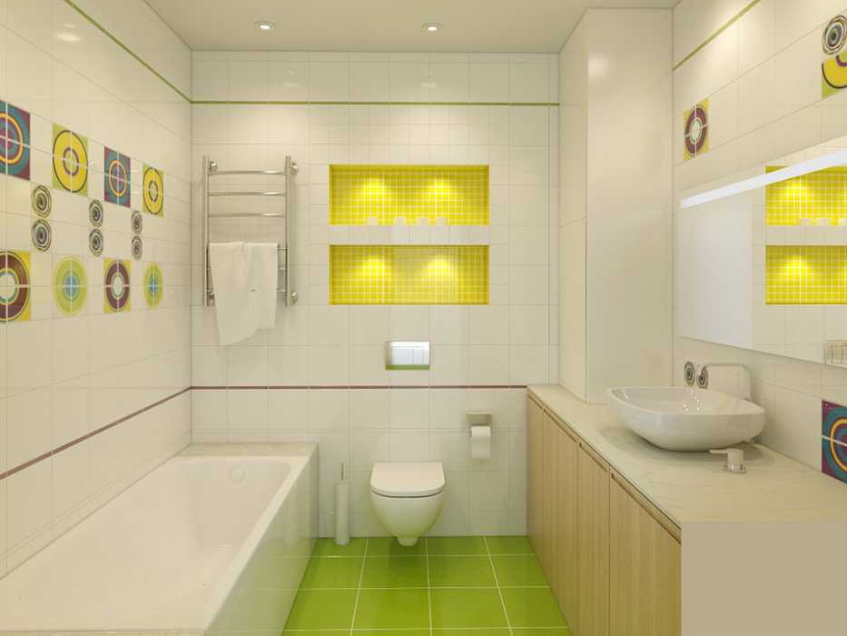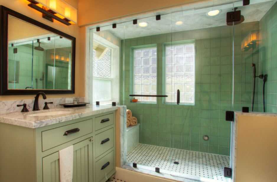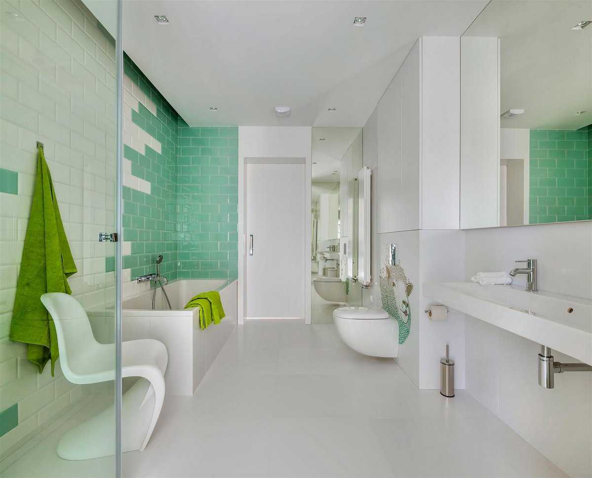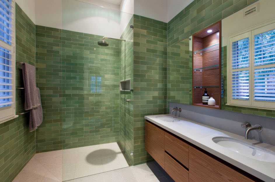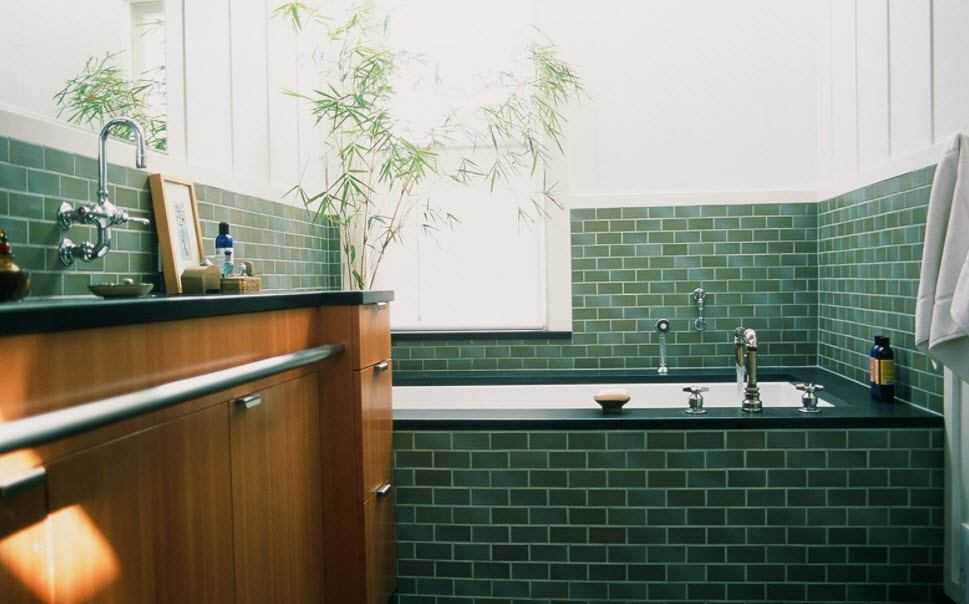 Зеленые тона хорошо раскрываются в ванной комнате. Цвет плитки в ванной морской волны умиротворяет. Салатовый насыщает помещение энергией, бодрит. Является цветом радости. Хвойные оттенки рекомендуется сочетать с серым, получается «сибирская» гамма. Зеленые цвета выгодно контрастируют с красными, насыщая интерьер динамикой.