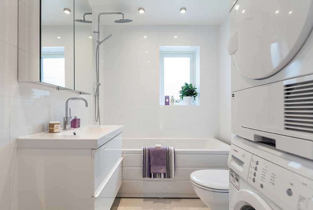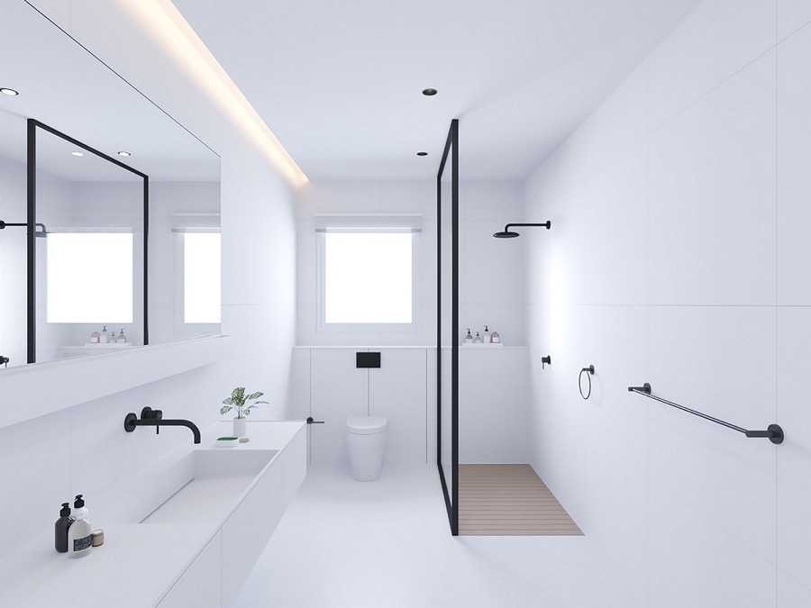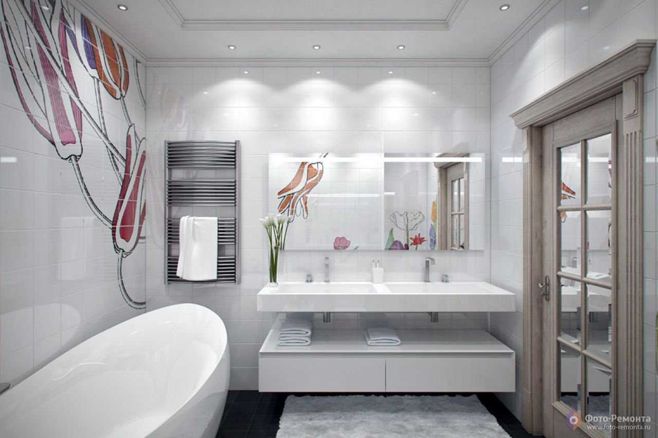 Белый цвет в таком антураже превалирует над другими. В такой палитре выполняют потолки, пол, стены, мебель, сантехнику. Для ванной лучше использовать чистые оттенки белого, без примесей. Лишь в некоторых деталях можно отойти на несколько тонов в сторону бежевого, розоватого, песочного. Дизайнеры не рекомендуют выполнять былым все поверхности комнаты. Достаточно лишь самых крупных. Например, белыми могут быть потолок, сантехника и мебель. Пол лучше сделать светло-серым или выбрать любой другой понравившийся оттенок.
