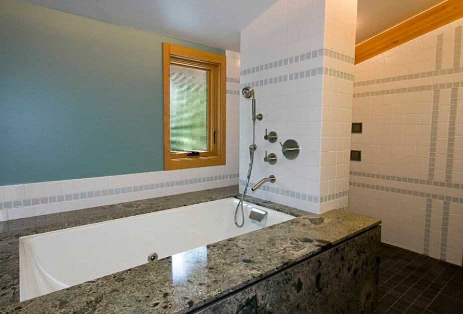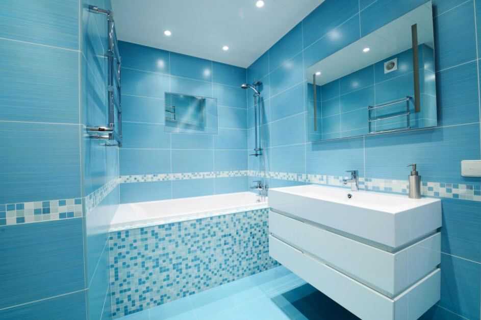 Также для поддержания ощущения свежести подходят оттенки синего и зеленого. Для этого они должны быть максимально холодными. Их можно комбинировать с белым, но в этом случае цветные поверхности должны доминировать. Интересно выглядит пол синего или голубого цвета. Он символизирует в этой комнате стихию воды. Мебель лучше сделать нежно голубой. В этом случае, принимая ванну, можно ощутить атмосферу умиротворения и гармонии.