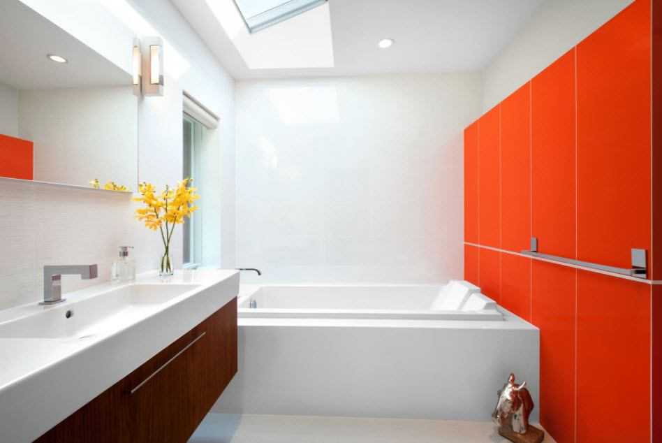 Можно выполнять зонирование оранжевой сантехникой. Посмотрите каталоги и вы увидите, что эти аксессуары просто великолепны. Проще всего будет приобрести акриловую ванну в оранжевом цвете, потому что окраска её поверхности не представляет технологических сложностей.