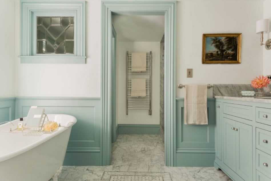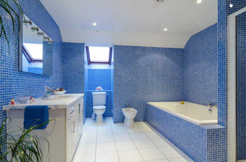 Синие оттенки в умеренном проявлении умиротворяют. Рекомендуется разбавлять белым. Синий скрадывает свет и пространство, потребуется хорошее освещение. Чаще используется для акцентирования в отдельных площадях ванных комнат.