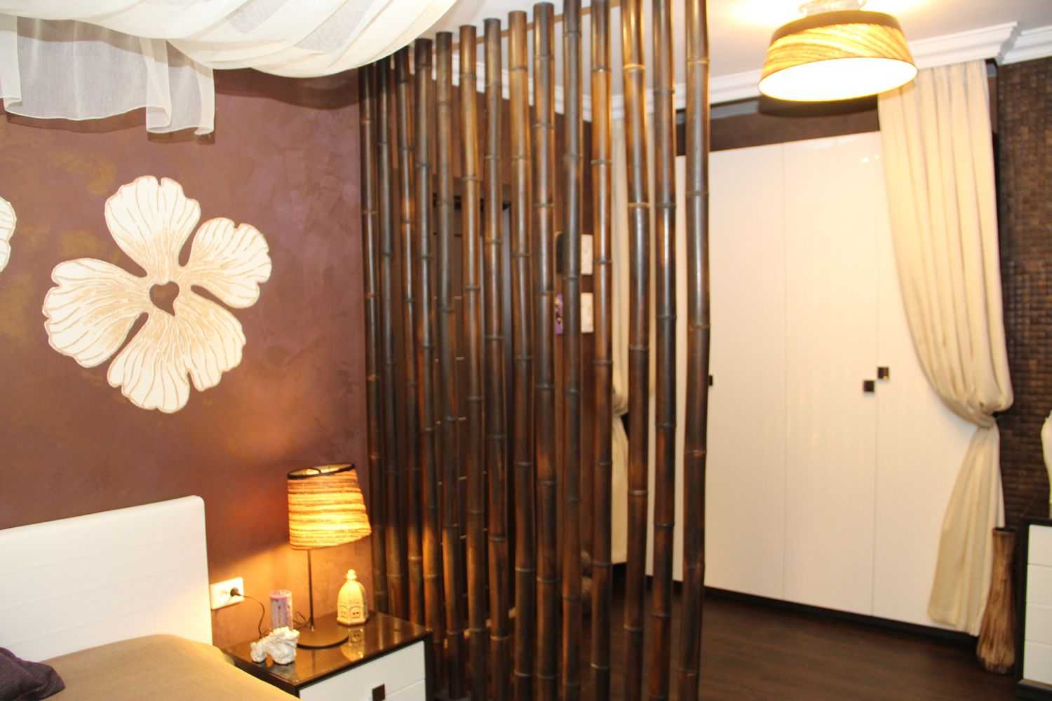 Всем тем, кто планирует разделить жилое пространство, но не знает как, советую декор бамбуком в виде ширм и перегородок. В продаже можно найти стационарные стены из бамбука, а также отдельные стволы.