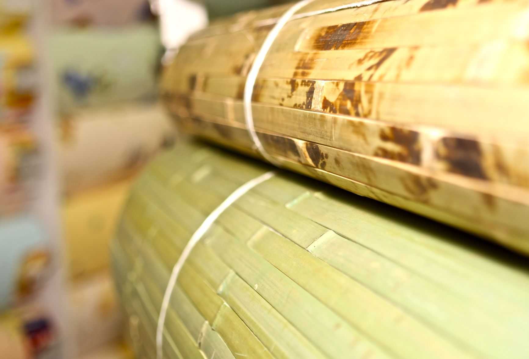 Стебель разделяют на ламели разной толщины (4-24 мм). Иногда их прессуют, тогда полосы получаются шире (25-100 мм). Пластины тонируют или оставляют в натуральном цвете, а затем приклеивают на матерчатую основу. Так получаются обои из бамбука. Стандартная длина рулона — 5, 10, 14 или 15 метров, а ширина — 90, 100, 180, 200, 250 или 270 см. Размеры приблизительные, возможны расхождения в несколько миллиметров.