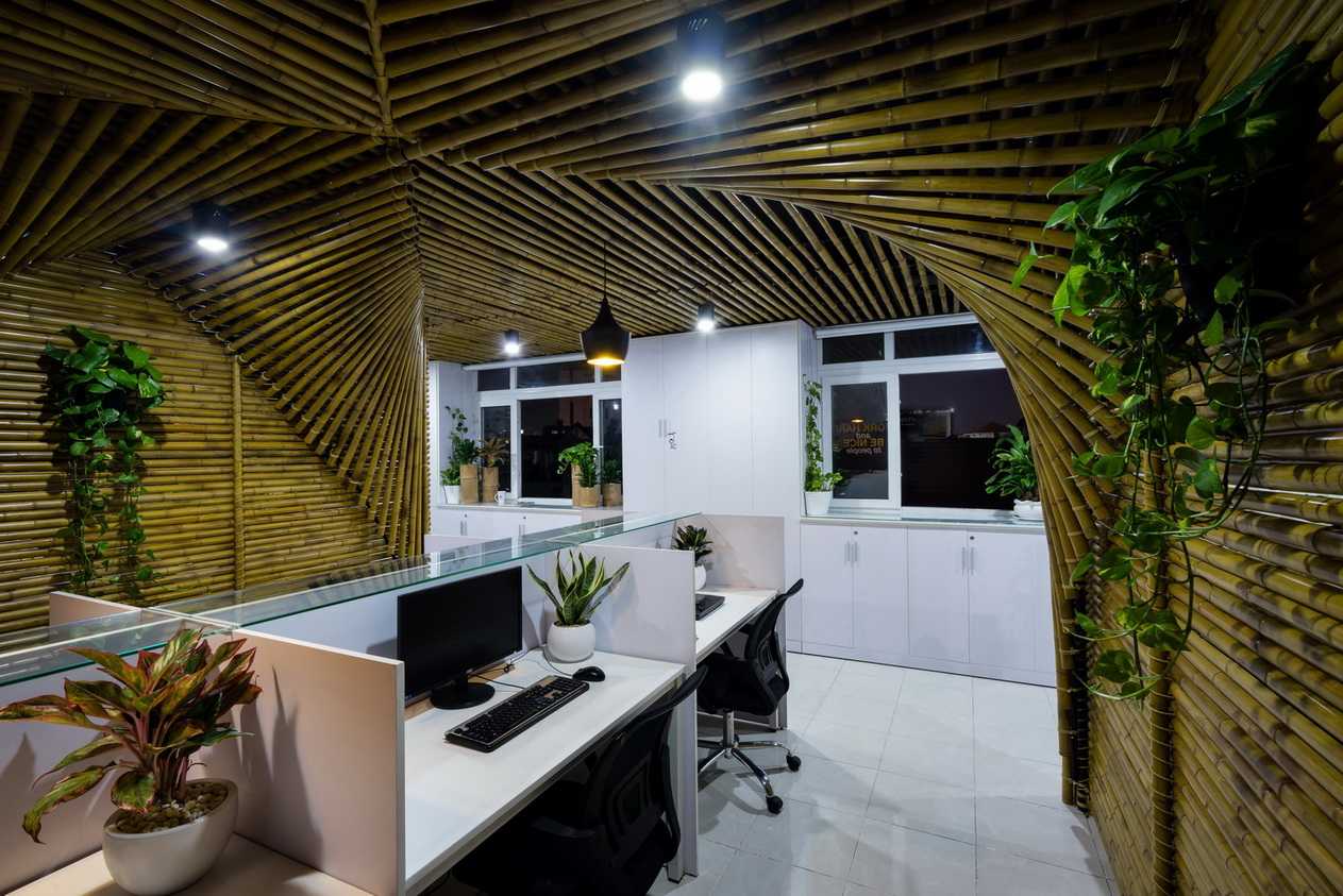 Сочетание темных бамбуковых стен с зеленой мебелью