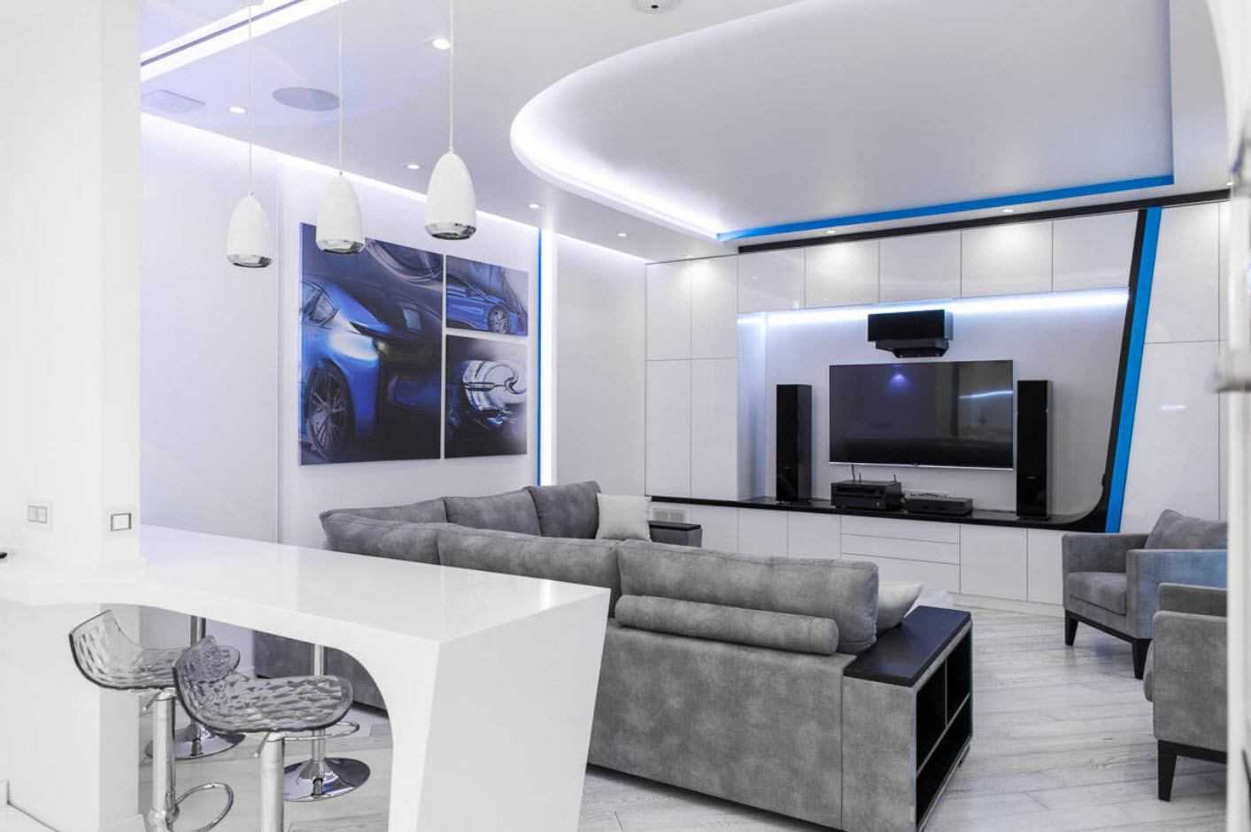 Белоснежные тона подходят и для современных интерьеров. Лаконичный белый цвет мебели отвечает философии направления хай-тек и позволяет получить почти футуристический интерьер. Лучшие материалы при выборе такого стиля — пластик и металл. В дизайне преобладают прямые линии, полностью отсутствуют узоры и закругленные элементы.