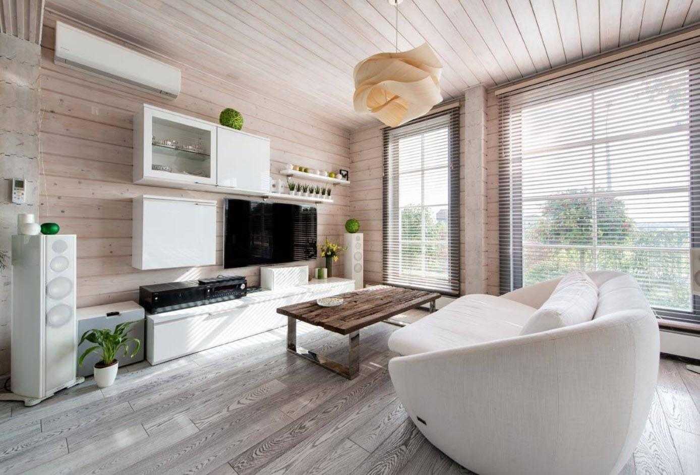 Выбеленное состаренное дерево гармонично сочетается с общим дизайном интерьера в белой гостиной. Его можно использовать для оформления пола и в качестве материала для мебели. Чтобы комната не казалась скучной и невыразительной, сочетайте разнообразную фактуру древесины. Необычная фурнитура и интересный текстиль помогут добавить красок в спокойные тона интерьера.
