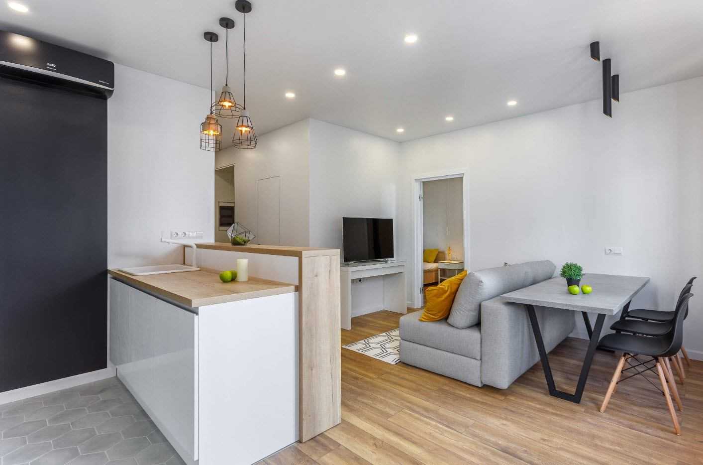 Если у вас студия, то остается лишь создать комфорт и обеспечить функциональность в зоне кухни-гостиной. Рекомендуем использовать натуральные материалы в теплых тонах.