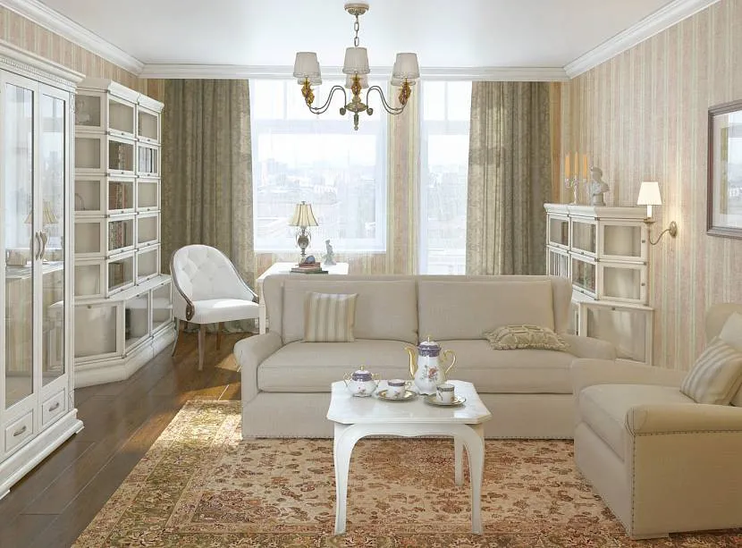 Белая гостиная также не должна производить впечатление совершенно стерильной и безжизненной. Напротив, уместными будут кремовые цвета и оттенок слоновой кости, теплый беж и нежная карамель. Прохладные серые и голубоватые тона также не станут лишними в гармоничном интерьере. Главная особенность стиля – использование сложных многогранных цветов, которые состоят из нескольких разных оттенков.