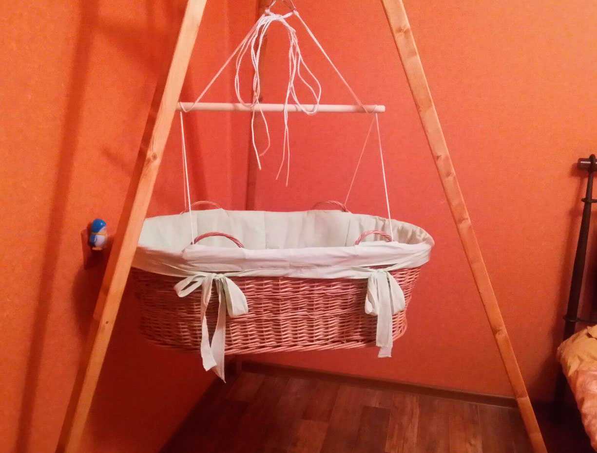 Можно сделать плетеную люльку из ивовой лозы. Для этого нужны минимальные навыки лозоплетения, ведь, по своей сути, люлька — это большая корзинка для малыша. Такие маленькие кроватки экологичны и очень легки по весу. Внутри люльки можно сделать мягкие бортики из ткани, набитой небольшим слоем наполнителя и постелить маленький матрасик.