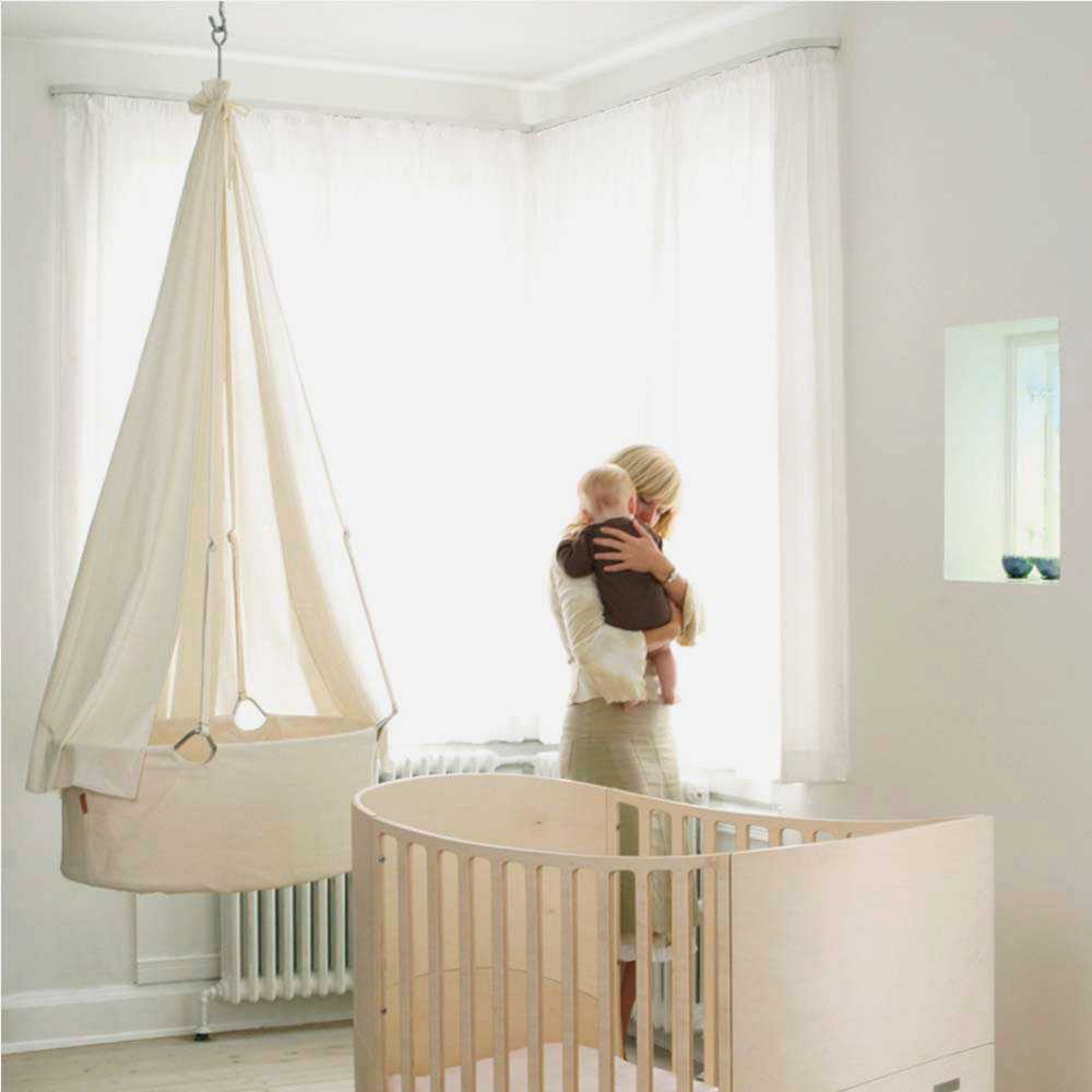В качестве альтернативы можно использовать более практичный вариант кроватки для новорожденных. Например, такую люльку, как на предыдущем фото. Стойка для подвесной колыбели может быть сделана в виде треноги, дуги или опор, как у детских качелей.