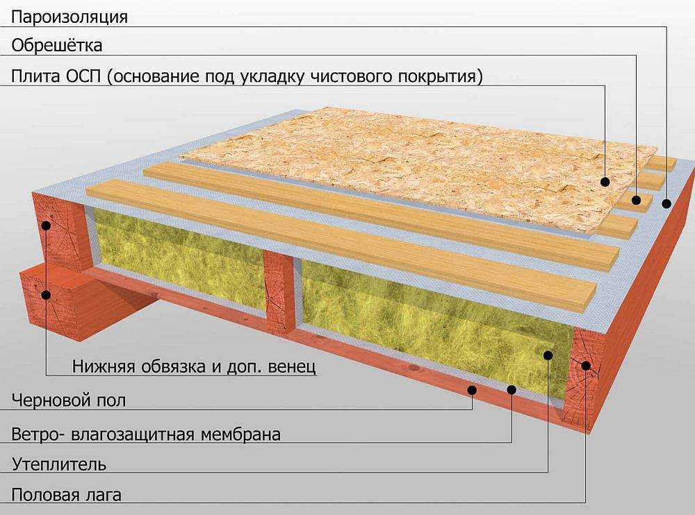 Если вы хотите обойтись без использования цемента для обустройства полов (причиной тому может быть проведение строительных работ зимой), то можно обустроить деревянные полы по лагам. Для этого необходимо на обрешетку, между промежутками которой надо уложить утеплитель, монтировать листы ОСБ.