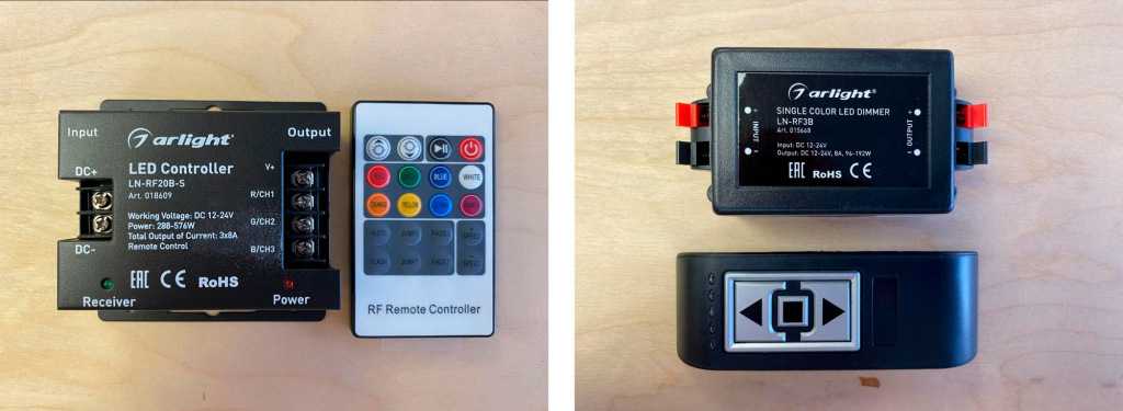 - управление – диммер для регулировки яркости, RGB контроллер для управления мультицветной лентой.