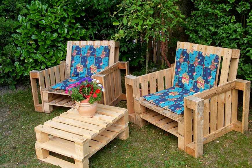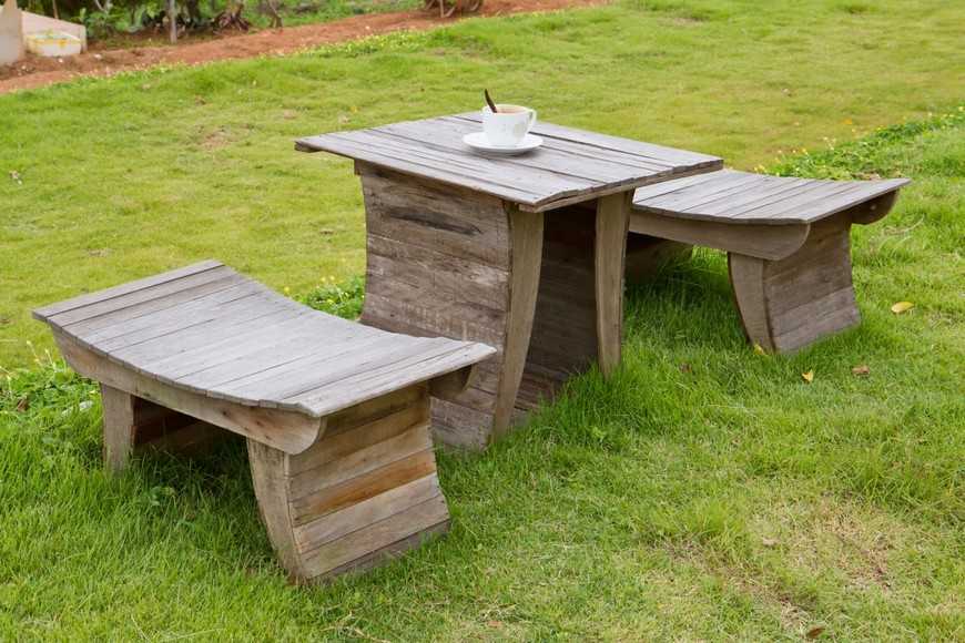 Для их создания пригодятся даже пни и коряги – главное иметь фантазию и минимальные плотницкие способности. Также для садовой мебели подойдут ненужные поддоны, пеноблоки и даже старые деревянные бочки.